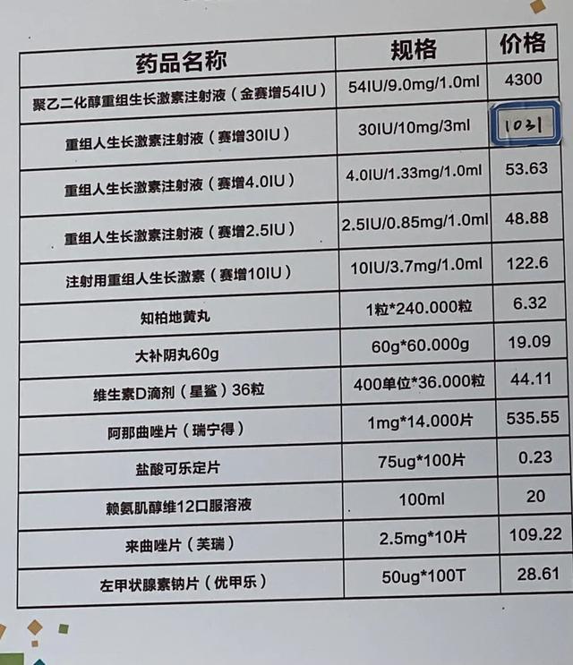 该诊所内公示的生长激素价格显示,长效生长激素(金赛增)每支 54 单位,价格 4300 元。水剂赛增每支 30 单位,1031 元。(注:有些药物如维生素、激素类生物制品等,化学成分不恒定或至今还不能用理化方法检定其质量规格,往往采用生物实验方法并与标准品加以比较来检定其效价。通过这种生物检定,具有一定生物效能的最小效价单元就叫「单位」( u );经由国际协商规定出的标准单位,称为「国际单位」( IU )。)